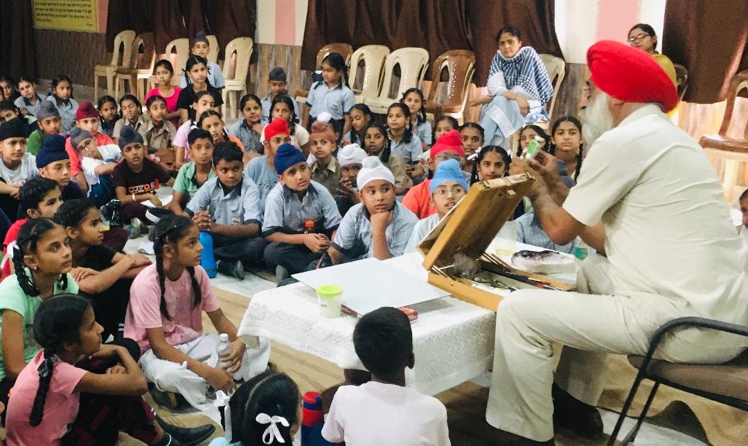 ਪਿੰਡ ਬਸੀ ਗੁੱਜਰਾਂ ਦੀਆਂ ਸਿੱਖਿਆ-ਸੰਸਥਾਵਾਂ ਵਿਖੇ, ਪ੍ਰਾਇਮਰੀ ਵਿੰਗ ਦੇ ਸਮਰ ਕੈਂਪ ਦੌਰਾਨ, ਵਿਦਿਆਰਥੀਆਂ ਨੂੰ ਪੇਂਟਿੰਗ-ਜੁਗਤਾਂ ਦੱਸਦੇ ਹੋਏ ਆਰਟਿਸਟ ਸ: ਇੰਦਰਜੀਤ ਸਿੰਘ ਬਾਲਾ